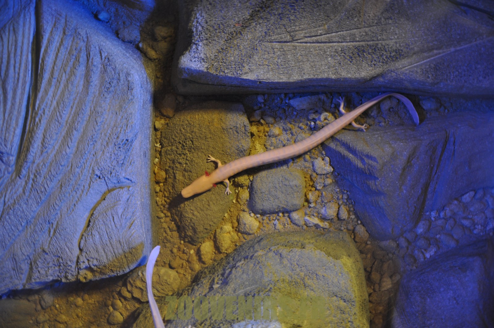Dans un terrarium enfoncé dans le sol du parcours de visite.